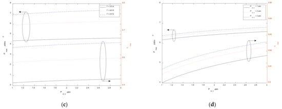 Figure 4c displays the influence of operating temperature on and of HT-PEMFC under different . Obviously, with the increase of hydrogen intake pressure, and will improve. The increase in pressure, on the one hand, increases the diffusion rate of the gas and improves the mass transfer of the reaction gas, which increases the reversible electromotive force of the HT-PEMFC; on the other hand, it increases the gas concentration and reduces the effect of concentration polarization on the reversible electromotive force. At the temperature of 433 K, boosts by 12.5% and the enhanced by 4.5% under the influence of hydrogen intake pressure.