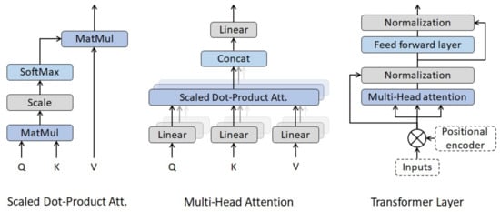 - Multi-Head attention. It can be considered the key component of the Transformer layers proposed by [54]. As shown in Figure 3, Multi-Head attention is composed of several scaled dot-product attention units running in parallel. Scaled dot-product attention is computed as follows:where Q, K and V are input matrices and the number of input variables taken into consideration within the dot-product attention mechanism. Multi-Head attention splits the explicative variables in different groups or `heads’ in order to run the different scaled dot-product attention units in parallel. Once the different heads are calculated, the outputs are concatenated (Concat operator) and connected to a feed forward layer with linear activation. Thus, the Multi-Head attention mechanism has the following expression:where h is the number of heads. It is also worth mentioning that all the matrices of parameters (, , and ) are trained using feed forward layers with linear activations.