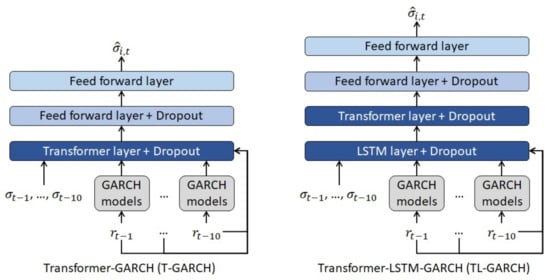 - Merging Multi-Transformer and Transformer layers with LSTMs leads to more accurate predictions than traditional LSTM-based architectures. Indeed, TL-GARCH achieves better results than LSTM-GARCH, even though the number of weights of TL-GARCH is significantly lower. Thus, the novel Transformer and Multi-Transformer layers introduced for NLPs purposes can be adapted as described in Section 2.4 and Section 2.5 in order to generate more accurate volatility forecasting models. It is also worth mentioning that Multi-Transformer layers, which were also introduced in this paper, lead to more accurate forecasts thanks to their ability to average several attention mechanisms. In fact, the model that achieves the lower MAE and RMSE is a mixture of Multi-Transformer and LSTM layers (MTL-GARCH).