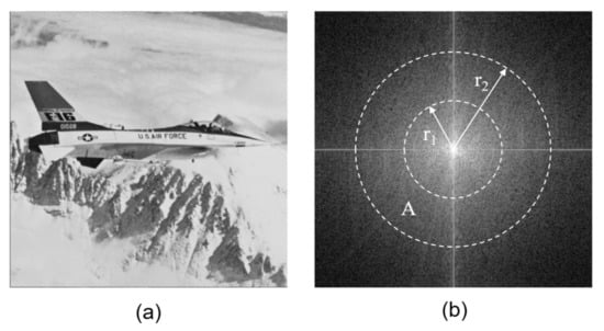 Watermark embedding in the DFT domain has a certain number of robust properties with respect to rotation, scaling and translation (RST) invariance as well as watermark robustness against common signal processing such as JPEG compression, filtering, and noise contamination, among others. A common factor that causes watermark detection errors in invisible watermarking is the synchronization loss between the embedding and detection stages when a watermarked image is processed by geometric distortions, in this way, DFT domain is often attractive and adopted by its invariant property against RST distortions. In the last few years, several DFT-based invisible watermarking methods have been proposed in the scientific literature [,,,,,,,,,,], obtaining promising results in terms of imperceptibility and robustness. When the magnitude of DFT is used as embedding domain in invisible watermarking [,,,], generally the algorithm selecting experimentally a pair of radiuses r1 and r2 in the magnitude M(u,v) that comprises a fixed annular area A = π(r22 − r12) between r1 and r2 that should cover the middle frequencies components in the DFT domain around the zero frequency term M(0,0). The reasons are because the modifications in the lower frequencies of M(u,v) will cause visible distortion in the spatial domain of the image. On the other hand, if a watermark is embedded in the higher frequencies of M(u,v), the watermark is often suppressed by the JPEG compression. Thus, the watermark should be embedded in the band of the middle frequencies of M(u,v) because, in this spectral region, it will be robust against common signal processing distortions, including the JPEG compression and at the same time imperceptible by naked eye. This fact is shown in Figure 1.