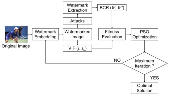 In the sake of brevity, interested readers on initialization, the search of best solution, iteration and convergency procedures of PSO, can refer to [,] for more details. As was mentioned in Section 2, use of fixed values for the pair of radiuses r1 and r2 in the magnitude M(u,v) in a heterogeneous image database will imply that the watermark strength factor α will be adjusted experimentally so as not to affect the robustness, but invariably the watermark imperceptibility will be affected. Thus, the aim of this proposal is to find the optimized values of the key parameters i.e., the pair of radiuses r1 and r2 in the magnitude M(u,v) used to build the annular area A, and the watermark strength factor α, proper for each image, instead to fix these values as is performed by the conventional DFT-based invisible watermarking methods, improving the performance in terms of robustness and imperceptibility using color images. The optimization procedure of watermarking parameters based on PSO is shown in Figure 4.