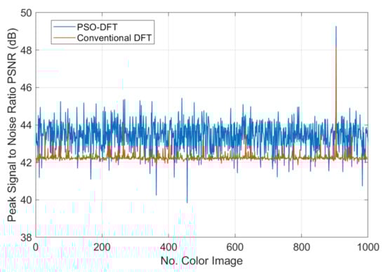 This section presents the experimental results for this proposal. The proposed method was tested on 1000 color images extracted from the COCO dataset [], which contains images of complex everyday scenes with common objects in their natural context. The experimentation was performed in terms of imperceptibility and robustness. To provide clarity in the testing, the results are reported as “PSO-DFT” and “Conventional DFT” labels in each figure, to show the improvements of performance obtained using the PSO algorithm in 2D DFT-based invisible watermarking. For conventional 2D DFT-based invisible watermarking, the values of pair of radiuses r1 and r2 are fixed at 50 and 150, respectively, and the value of the watermark strength α is 1.5, accordingly to our previous proposal reported in [].