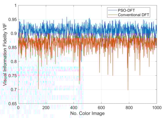 From Figure 5 we show that the average PSNR obtained employing PSO is 43.42 dB, meanwhile, not using PSO it is 42.27 dB. In terms of average PSNR the gain in dB is hardly 1.15 dB. However, there exist two aspects that must be considered: The first one is that, from Figure 5 the comparative one-to-one show in almost all images a gain of approximately 1.5–2 dB, meanwhile for few images there is a small loss in dB. This behavior is related to the trade-off between imperceptibility-robustness of digital watermarking. The second one, and the most relevant, as is known in the literature, is that the VIF value reflects perceptual distortions more precisely than peak signal to noise ratio (PSNR) according to reference []. The range of VIF is [0, 1] where the closer value to 1 represents the better fidelity respect to the original image. In this way, the imperceptibility results in terms of VIF are shown in Figure 6.