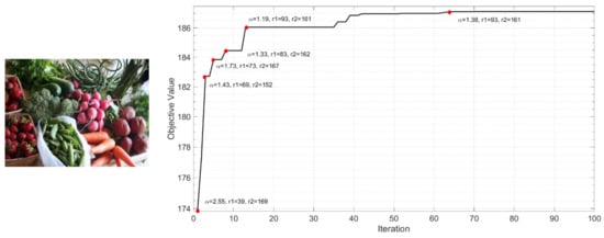 The fitness value increases when VIF and BCR values grow. The VIF [] and BCR values have been multiplied by 100, since its normal values fall in the range [0, 1]. In training of the PSO algorithm, the watermark strength factor and the pair of radiuses r1 and r2 in the magnitude M(u,v) are and . The parameter values in the PSO algorithm are given in Table 3.