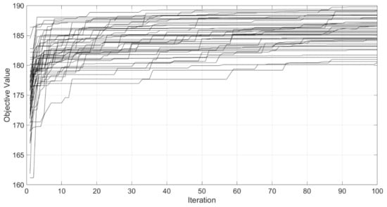 The PSO algorithm was first introduced by [] in 1995. In general terms, PSO is a search and optimization method for swarm intelligence techniques and evolutionary algorithms. According to [], the PSO algorithm is inspired by the social behavior of a group of individuals (in PSO denoted as a particle) e.g., as a flock of birds moving together. Each particle keeps track of the individual best value, and PSO searches the global best solution in terms of the objective fitness function []. PSO is defined as updating velocity υ of each particle (11) and updating position δ of each particle (12), respectively: