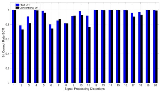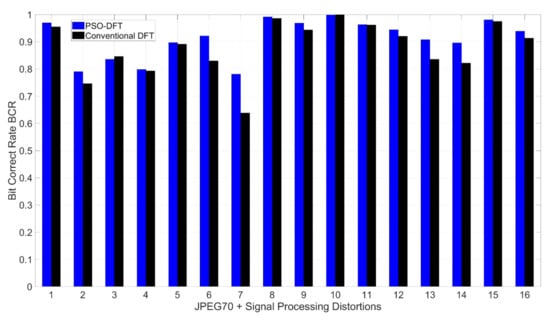 Considering 1000 color images extracted from the COCO dataset [], and a binary watermark of L = 32 bits, in Figure 11 we summarize the average BCR obtained by PSO-DFT and conventional DFT watermarking respectively, against the several signal processing distortions, such as Joint Photographic Experts Group (JPEG) compression, among others, given in Table 5. The values of a pair of radiuses r1 and r2 are fixed at 50 and 150, respectively, and the value of the watermark strength α is 1.5, according to the conventional proposal previously reported in []. For the sake of brevity, in this testing we include aggressive tolerances for some attacks, assuming that the minor tolerances are detected in a successful manner.