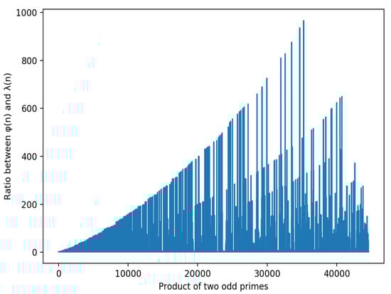 Comparison between Carmichael and Euler functions for the product of two primes.