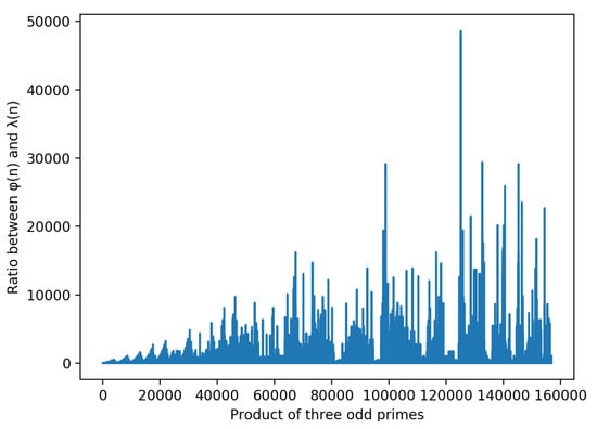 Figure 3 and Figure 4 present, respectively, the ratio when n is a product of two primes, respectively, three primes.