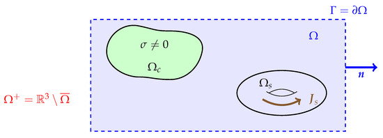 Let denote the complement domain , exterior to . Furthermore, we assume that everywhere in . Following the approach of [6], which is based on the Stratton–Chu formula, we can represent the vector potential in as
