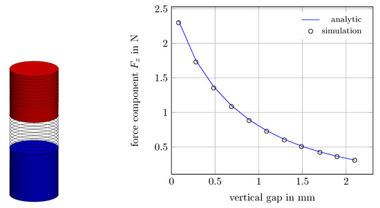 To begin with, we look at the force between two permanent magnets. In particular, the case of two rectangular parallelepipeds with parallel axes and the case of two cylindrical magnets with the same central axis are analysed. As reference for these cases, the analytic solutions given in [21] for the parallelepipeds and in [22] for the cylindrical magnets are used. The left images in Figure 4 and Figure 5 show the simulation setup where in both cases the magnetisation is the vertical (z) direction. The right plots in these Figures show the outcome of the analytical model of the references and the simulated results for various positions of the red magnets. Plotted are the total force acting on the blue magnets. The precise setups of the models, that is magnetisation value and geometry parameters, are given in the references [21,22] where, in addition, experimental validations of these models have been carried out.
