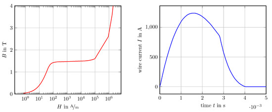 In this example, we consider an application in which electromagnetic forces are used to accelerate a conducting, magnetic object. In its most simple version, a coil is temporarily subject to a direct current that generates a strong magnetic field. This, in turn, magnetises the projectile, which is then being sucked into the coil. If the current is turned off at the right time, this acceleration is never reversed and the object keeps moving in the desired direction. Coil guns typically work with this principle and often contain a series of such coils that further accelerate the object by precise timing of activation and deactivation of the currents. In the presented example, we use the setup of [26] with a coil of 203 turns and a current density as given in the left plot of Figure 11. The material behaviour of the projectile is described the -relation as in the right plot of the same figure.