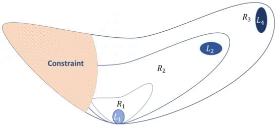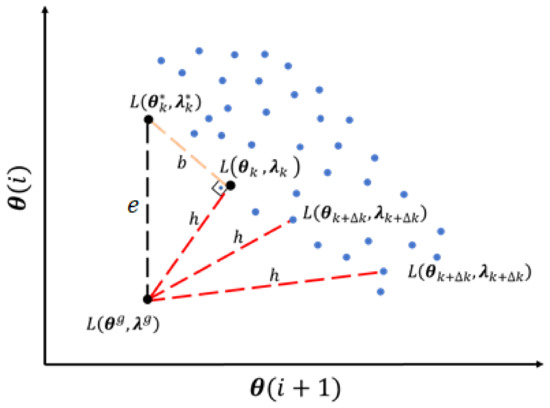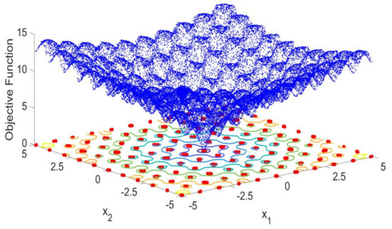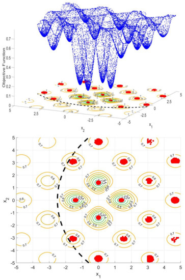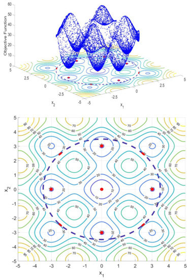 In addition, considering that a global optimal solution, , could be obtained by the analytical solution of the objective function, the Lagrange expression is represented by . It is important to highlight that this, , is a theoretical concept that no optimizer will achieve, but will search for the best approximation to it. Therefore, the optimal solution obtained by the optimizer in the search to approximate to is represented by , whose Lagrange expression is defined as . These concepts are exemplified graphically in Figure 1, where the points are the meta-heuristic population after all iterations; therefore, a set of solutions from a determined number of iterations is defined as .