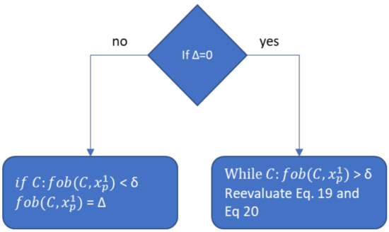 Then the objective function and the set of constraints, , are evaluated for each particle position . There are two ways to address the constraints issue here, through a penalty function or straight evaluation. The first option introduces a new parameter to the optimization problem, which is the penalty. This parameter might affect the efficiency constraining the fly landscape. On the other hand, the straight evaluation of the constraints will make the algorithm computationally heavier. As the developed algorithm is meant to deal with complex optimization, it was decided to adopt both options which can be chosen by the user following the case study. This point is one of the points that this PSO variant diverges from the others found in the literature. Thus, the algorithm will work as presented in Figure 3, where δ is the constraint value, ∆ is the penalty factor.