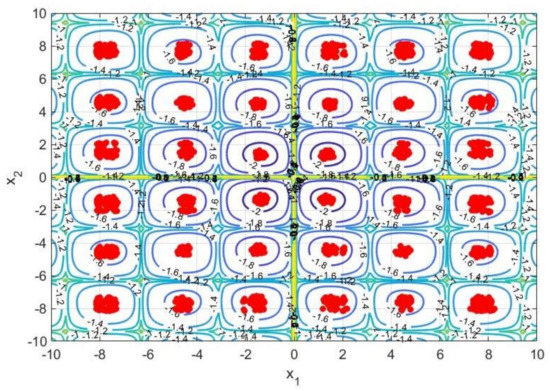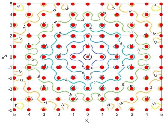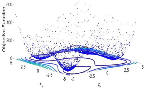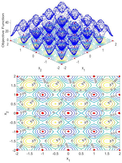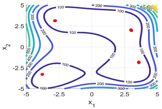 Figure 9 shows this final benchmark which has different properties than the previous ones. As it is possible to see this function has a very flat landscape where it is possible to find four local minima: ; ; ; . The contour map is also provided for this function providing a more detailed visualization of this topography in 2D plane. It is possible to see that in this case, the above mentioned “puddles” are not found in the contours. Instead, two large areas for objective function equal to 100 are observed. Within these areas, the local minima are found. This is a representation of how flat/shallow the landscape is, which barely changes its slop until the minima are found. Moreover, in this case, the proposed methodology was able to fully identify all the local minima and the global ones.