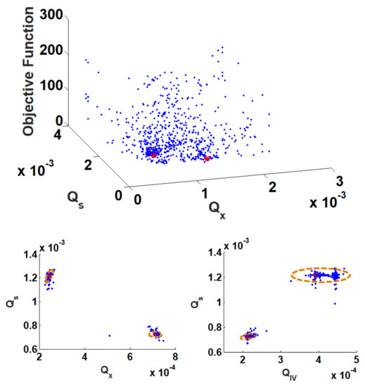 Figure 10 presents the results obtained after applying the proposed methodology to solve the TMBR optimization problem. It is provided in the figure the objective function landscape, the optimal points confidence regions, and the contour of the expected region for the local minima. The information about the contour of the expected region was obtained from [29] and used as a reference to check the CSPSO result. As it is possible to see from Figure 9, the algorithm was able to identify the two local minima of the objective function and describe with precision the confidence region of the optimal point, with a confidence level of 99%. This means that any of these points inside the confidence region will generate an optimal operating condition in the process.