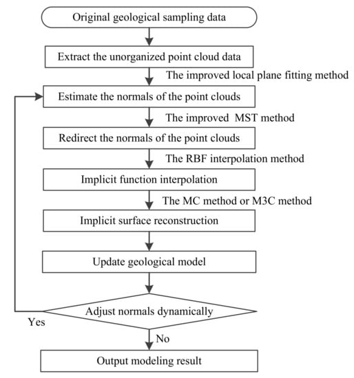 1. Extracting the unorganized point clouds data from the original geological sampling data and using the improved local plane fitting method to estimate the normal of the point clouds. To ensure that the normals of the point clouds all face the exterior of the geological model, the improved minimum spanning tree (MST) method is used to redirect the normals of the point clouds.