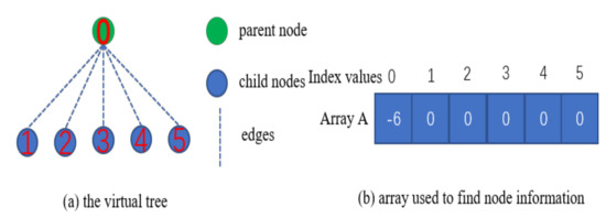 The second step of the method is to construct a virtual tree TV for those points whose normal has been adjusted manually. By using a set P to represent those points whose normal has been adjusted manually, a point p in the set P is selected as the parent node of all the remaining points in the set P, and the remaining points in the set P are all child nodes of the node p. By using these nodes to construct a virtual tree, each node in the tree is numbered in order (), where represents the total number. Figure 4a shows the structure of the virtual tree. This paper uses an array A to store the node information using the method of union-find sets. The index value i of each element in the array corresponds to the node numbered i in the virtual tree, and the element value corresponding to each index value i in the array represents the number of the parent node of the node numbered i in the virtual tree. The parent node in the virtual tree does not have its own parent node. To ensure that the element with index 0 in the array exists, this paper assumes a virtual parent node for the parent node in the virtual tree, and the corresponding value is . Figure 4b shows the structure of array A.