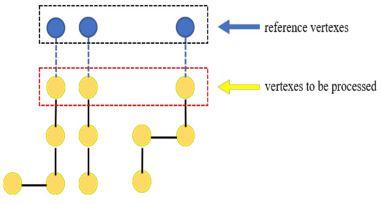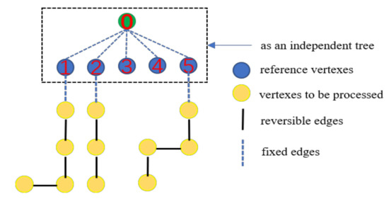 The fourth step of the method is to remove virtual tree TV from minimum spanning tree TM to obtain multiple subtrees Ti. The normals of nodes in the virtual tree TV have been adjusted manually. The normals of nodes in the virtual tree can be considered to be facing outside of the model correctly, and there is no need to flip them in the process of normal propagation. Therefore, before performing normal propagation, the virtual tree TV needs to be removed from the minimum spanning tree TM to obtain multiple subtrees Ti. The normal propagation is performed by selecting the reference vertexes on the fixed edges of the subtrees as the starting points. Figure 6 shows the structure of the subtrees.