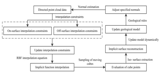 2. The interpolation constraints are constructed based on the oriented point clouds data, and the radial basis function (RBF) interpolation method [27] is used to obtain the implicit function that represents the geological model. To obtain the polygonal geological model, reconstruct the surface of the interpolated implicit function using the marching cubes (MC) method [28,29] or the multiple marching cubes (M3C) method [30].