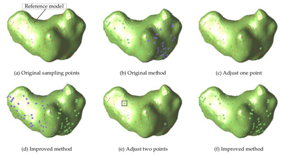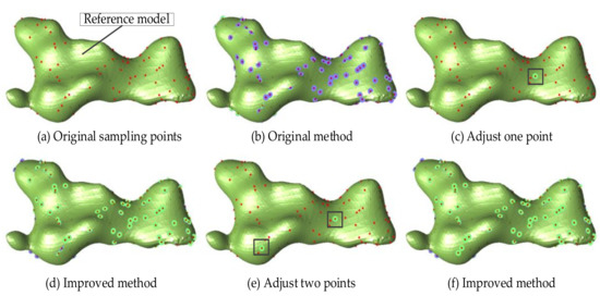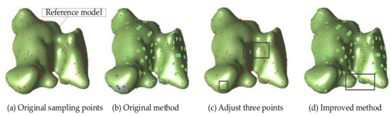 Figure 9 shows the normal estimation results of the second data set. The model shown in the picture is only a reference model, the purpose is to analyze and evaluate the results of normal estimation. Figure 9a,b respectively show the original geological sampling points and the normal estimation result obtained by using the original local plane fitting method. As the number of the points with existing normals increases, the results of normal estimation become more accurate. After only specifying the normals of two points, the normals of most points are greatly improved compared with the original method. However, as shown in Figure 9b,d, when the normal direction of only one point is adjusted, the normal estimation result obtained by the improved method has errors. Normals with correct orientations in the original method are reversed to the wrong orientations. This is because the improved method in this paper uses the breadth-first search method in the process of normal propagation. The points whose normals have been adjusted will preferentially affect the near points, while the far points will not be affected. Therefore, to obtain more accurate normal estimation result, it is necessary to adjust the normals of points in different regions. In this way, it can be ensured that the normal estimation result of each region is correct.