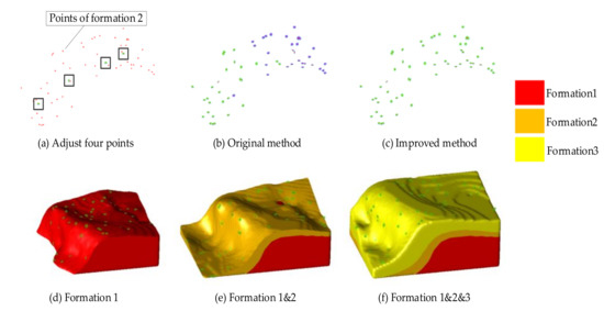 Normal estimation and modeling results of the third data set. (a) shows that the normal directions of the four points have been adjusted artificially. (b) is the normal estimation result obtained by using the original method. (c) is the normal estimation result obtained by using improved method in this paper. (d–f) show the geological modeling results obtained by using modeling method in this paper.