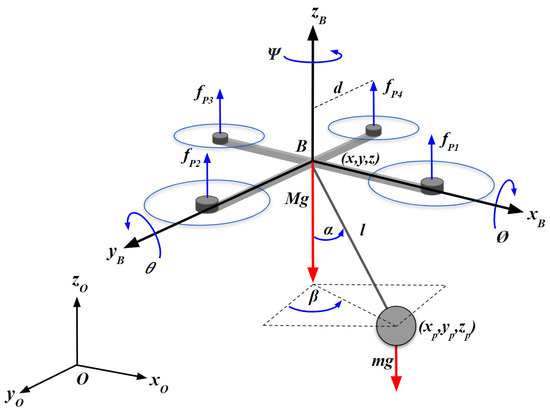 The Euler–Lagrange equations of motion represent an adequate and convenient analytical method to obtain the dynamic model of the system. Their mathematical structure allows one to analyze and study in detail all the physical phenomena of the plant quadrotor-payload, since the dynamic nature of the system is highly nonlinear, underactuated, and multivariable, and the subsystems are strongly coupled.