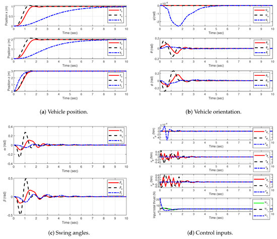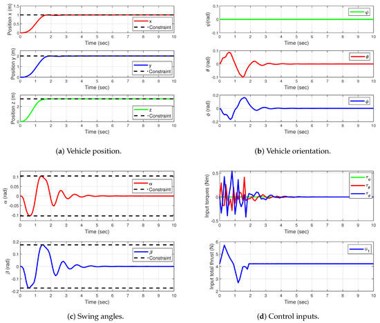 Figure 2a displays the positions x, y, and z of the quadrotor with their respective constraints , , and . The signals responded quickly to reach the reference in no longer than 3 s. The controller kept each constrained position x and y at its reference value without any overshoots in the transient responses to avoid further oscillations of the load angles.