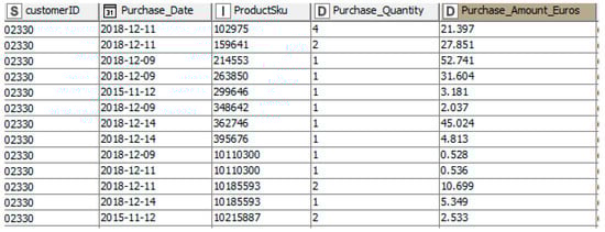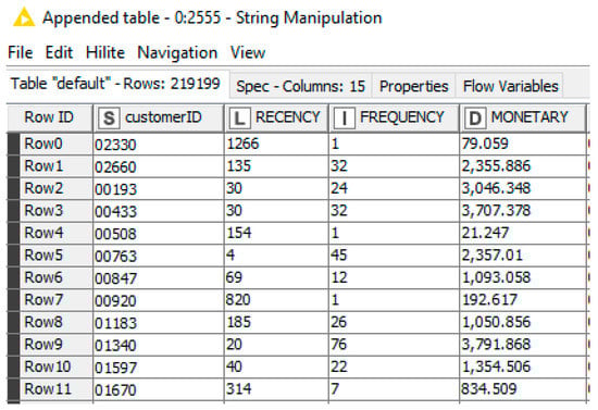 - Customer aggregation: in this phase, T is aggregated at the customer level, obtaining the set TU = {(u1, r1, f1, m1), …, (u#U, r#U, f#U, m#U)}, where re would be the days since the last purchase of the customer ue (using a later fixed reference date for all customer purchases), fe is the number of times the customer has purchased and me contains the total amount of these purchases.