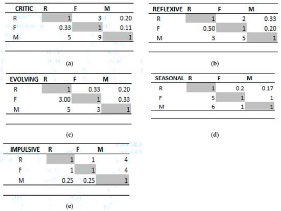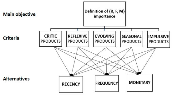 Our proposal is an extension of the fuzzy linguistic 2-tuple RFM model, and it is applied to both historical and current products purchased by customers, to calculate the customer value based on the RFMScore. Wong and Wei [48] calculated the weighted RFMScore. The weight determination for each variable of the RFM to create the RFMScore depends on the factor’s importance in the application (Dursun and Caber [49]; Peker et al. [50]); some authors applied the same weights to each attribute (Peker et al. [50]; Hamdi and Zamiri [51]; Weng [52]), but other researchers applied the analytical hierarchical process (AHP) to define the correspondence weights, such as Moghaddam et al. [25], He and Li [53], Rezaeinia and Rahmani [54], Marisa et al. [55], Patel et al. [56], Hosseini and Mohammadzadeh [57], Dachyar et al. [58] and Monalisa et al. [59]. We will take advantage of their findings and use AHP to define the different weights of each RFMScore per product category, obtaining a more complete approach to customer preferences and customer value.