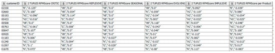 Therefore, the following variables are calculated: Re, Fe, Me, RFMi ∈ S × [−0.5, 0.5). For each customer ue, i = 1, …, #U, we obtain Ae = (Ae1, Ae2, Ae3) with Ae1 = Re, Ae2 = Fe and Ae3 = Me. First, customers are sorted in ascending order according to each of the individual components Be = (Be1, Be2, Be3), with Be1 = re, Be2 = fe and Be3 = me, contained in TU. Now, we define rankei ∈ {1, …, #U} as the ranking of each client with respect to each of these variables: