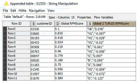 In marketing, customer lifetime value (CLV) is the value that a customer contributes to a business over the entire lifetime of a company. It can also be defined as the net present value of the cash flows attributed to the relationship with a customer, and consequently, it emulates a customer’s future profitability (Gupta et al. [22]; Kumar and Reinartz [23]). It is a useful metric used by marketing managers, especially when they focus on customer acquisition and retention. In this study, we worked with the RFM model and calculated the customer lifetime value based on the RFM values, which we call the RFMScore.