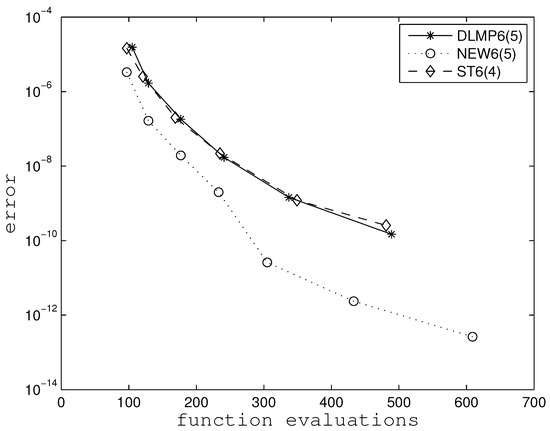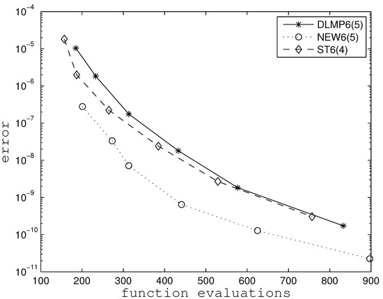 The norm of the principal truncation error coefficients is , which is much greater than the corresponding value for DLMP6(5). The interval of absolute stability is , which is of the same magnitude as that of DLMP6(5), being . We also mention that the corresponding principal truncation error norm for ST6(4) is , while this pair shares a small stability interval of . All truncation errors were measured in the reduced set valid for problems of the form (2); see [24].