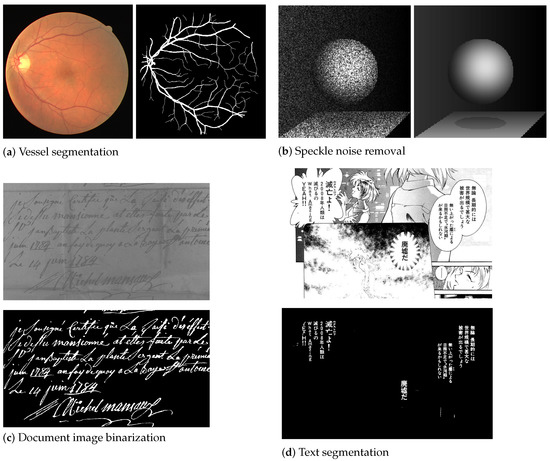 Examples of image-to-image transformations. (a) [14], (b) synthetic data, (c) Synchromedia Multispectral Ancient Document Images Dataset–SMADI [15,16], (d) EvaLady ©Miyone Shi, from Manga109 dataset [17,18].