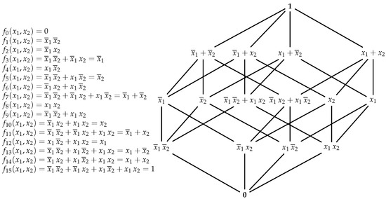 The set with the usual set inclusion ⊆ is a Boolean lattice. The set equipped with the partial order relation ≤ defined as, for any , , and the operations , , , point-wise extension of the binary logic operations +, ·, and , is also a Boolean lattice. It is well known that any non-null element in can be expressed uniquely as a join (component-wise logical sum) of a subset of the atomic elements , just like any set can be expressed as a union of unitary sets corresponding to each of its elements. The set of all Boolean functions of the form with operations and partial order relation inherited from is also a complete lattice, isomorphic to the lattice .