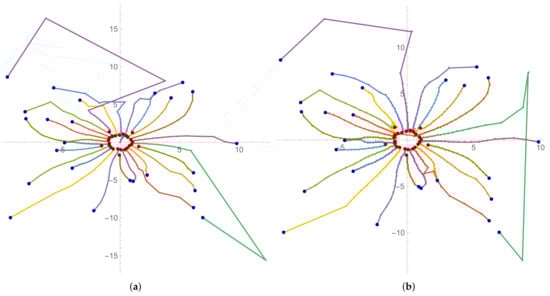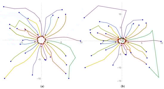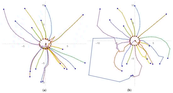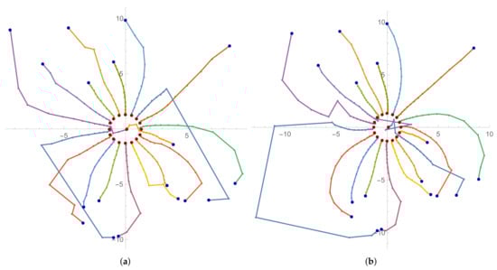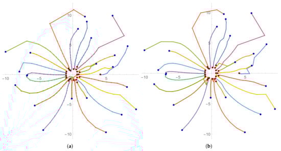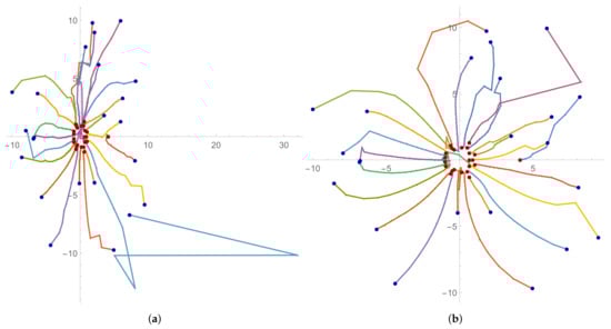 In Figure 3 and Figure 4, one can see the trajectories (95) of the approximations of the EW, EN, EE and EH methods for Example 2. For instance, in Figure 3a we can see trajectories of the approximations of the EW method for the first 44 iterations . Here we observe an interesting phenomenon: one of the trajectories goes in the opposite direction of the roots and after moving away quite far it changes its direction by moving horizontally, then it goes in the opposite direction of the roots again, but finally it turns back and finds its root.