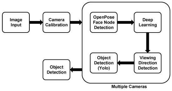 We summarize this research method as follows (Figure 1). After using OpenPose to capture the nodes of the person’s face, we established a deep learning network for sight training. After that, we used the YOLO object detection model and combined the models to calculate the objects in the person’s line of sight. With various cameras, we can estimate the objects in the line of view more accurately from multiple angles. Our method will reduce the cost of equipment and reduce battery consumption when combined with drones.