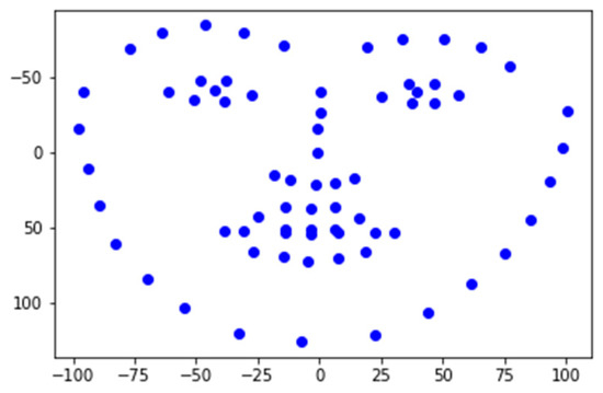 Convert the coordinates of each face point to the coordinate point (Equation (1)) centered on the nose node (point number 30) of the face nodes, where w is the image width, and h is the image height (,) The coordinates of the face nodes are centered on the upper left corner of the image. () is the face node centered on the nose node, as shown in the left image to the right picture of Figure 3.
