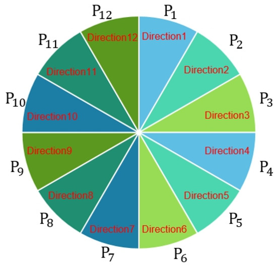 Then, we used the line segments from the point () to the point () and from point () to point () to represent the viewing direction (Equation (9)).