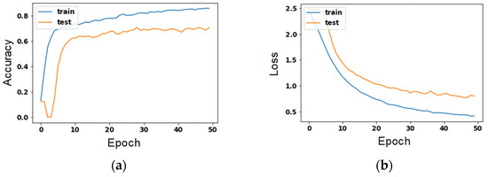 Value of training times for the combination with the highest accuracy. (a) accuracy’s change to each epoch; (b) loss’s change to each epoch.