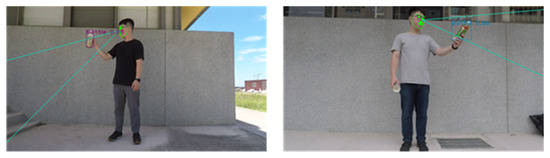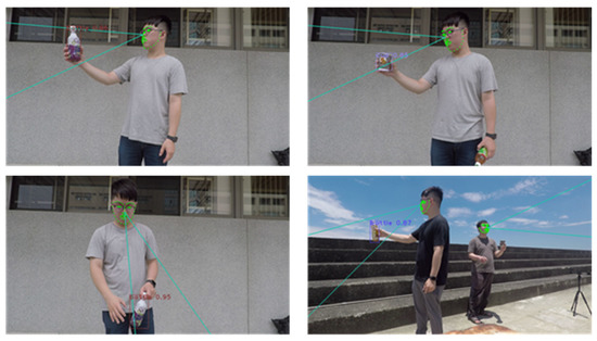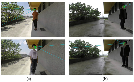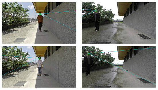 When the human body is in the center of the screen, we find that the visual direction detection model can also calculate the visual direction of different human bodies (Figure 7). The effective distance is greater than the previous visual direction detection methods. When the person is at the edge of the screen, the sharpness of the edge image decreases. However, when the face nodes are still valid, the direction detection model can also calculate the direction of the person’s view. Therefore, we believe that whether the person’s perspective can be successfully detected depends on whether the face image node is recognized. Since we have performed wide-angle distortion correction in the set direction of GoPro, even when the portrait is at the edge of the screen, the face nodes do not deform. Therefore, under the condition that the face nodes can be detected, the person’s perspective can be recognized at any screen position.