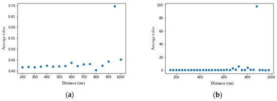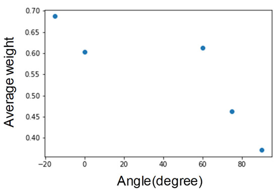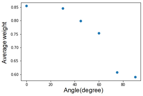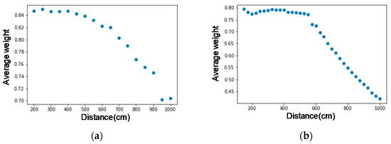 As shown in Figure 8, the X-axis is the distance (centimeter), and the Y-axis is the average value of each point of the face and the nose midpoint vector normalized. From the figure, we find that the displacement of the face nodes starts at about 6 m, which deviates from the actual face contour, and the deviation becomes more significant and more prominent after 6 m. Next, we look at the weights of face nodes (Figure 9), where the X-axis is the distance (cm), and the Y-axis is the average weight of all face nodes. Again, we can find that after 6 m, the decrease in weight increases significantly. In this experimental environment (1920 × 1080 pixels), the size of a face 6 m away from the lens is about 32 × 32 pixels. Therefore, we think that the resolution of the face may be too small, resulting in lower recognition of the face.