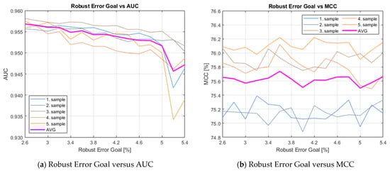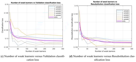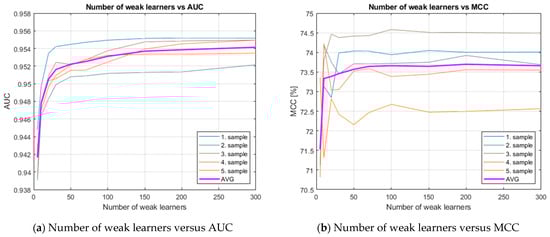 The increase is steep at the very beginning of the monitored range, as shown in Figure 2a,b. At the point of 100 learners, the AUC increase in the trend is subtle, while the MCC is relatively settled. Therefore, the number of weak learners remained at the default setting, 100 learners. Apart from rising time consumption, both the metrics and the classification loss did not show any significant improvement.