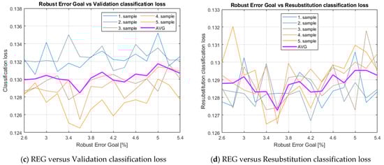 We determined that the optimal value of this parameter is 3.6% because the AUC and MCC metric achieve relatively stable and high values in this area, while the resubstitution and validation classification loss were the lowest, as can be seen in Figure 1c,d. If the REG is more than 5%, the AUC decreases continuously. However, the MCC was relatively stable around 75.5%, until REG rose to 9%; then, it dropped sharply to 69% (note: not shown in the figure).
