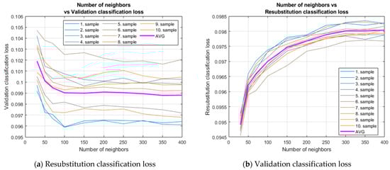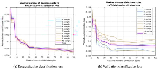 We used the iterative method to find out the most suitable parameter values. We monitored AUC and MCC metrics throughout the iteration process with the validation and resubstitution classification loss. In general, the classification error or loss is the weighted fraction of misclassified observations. Such an error measured in the validation sub-sample is called the validation loss. When measured in the training sub-sample, this error is referred to as the resubstitution loss. We looked for the appropriate interval where the AUC and MCC metrics showed good results in the first step. Afterwards, we examined the interval with a focus on a proper balance between these classification losses.