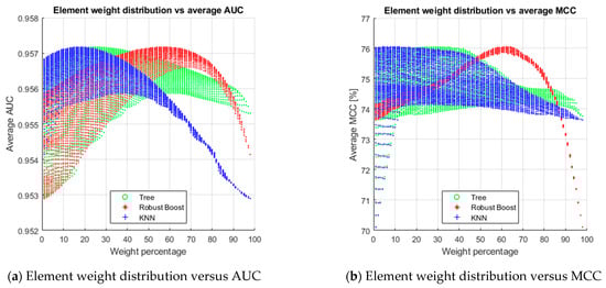 The initial weights distribution was estimated according to the recent research done in this field of interest. Brozyna et al. [37] or Sivasankar et al. [82] show that the CART performs better than k-NN. Research by Adamko and Siekelova [83] and Pisula [84] show that ensemble models, whether boosting or bagging, are achieving even higher accuracy and more valuable results. Hence, the weight of the main element was present to the highest proportion. The initial scores proportion was set as follows—a ratio of RobustBoost-to-CART-to-k-NN is 50-to-35-to-15. Nevertheless, the final voting proportion is one of the issues in this study.