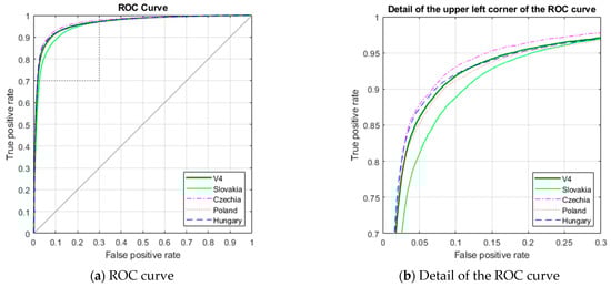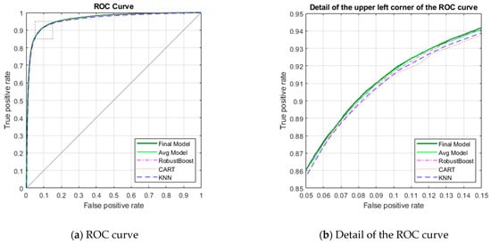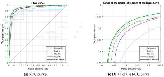 Expect for AUC, some metrics derived from the confusion matrix were also used to measure the models’ quality. This matrix stores numbers of true positives (TP), true negatives (TN), false positives (FP), and false negatives (FN). These values are usually used for the calculation of many measures. From these, we use an accuracy (ratio of all positives to all cases), sensitivity (also True Positive Rate—TPR), specificity (also True Negative Rate—TNR), and F1 Score defined by Equation (1).