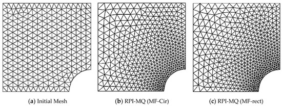 A problem involving a square portion from an infinite elastic plate having a circular opening with a radius (a) of 1 unit is also analyzed to demonstrate the effectiveness of RPI-based displacement recovery technique in stress concentration conditions. The one-quarter of the plate domain is modeled because of the symmetry of the plate. The plate domain with an opening is discretized with triangular/quadrilateral elements, as shown in Figure 5. Along the symmetry line, the normal displacement component and shear stress are zero. A unit in-plane traction is applied in the x-direction. The close form solution of stress field for an infinite plate with opening is given in Equations (38)–(40) [4].