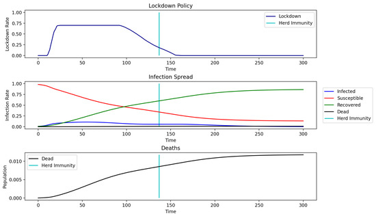 In the future, we could expand this model in a variety of ways. The SIR model is a very simple and elegant method of modeling disease transmission, but has its drawbacks because of this lack of complexity. For example, Reference [27] reported inaccuracies when applying SIR models to a case study on the city of Isfahan. More complicated models, such as those that take into account fading immunity over time (SIRS) or include an incubation period (SEIR), could be used to further increase the accuracy of the model. However, Reference [28] found that an SIR model performed better than the more complex SEIR model when matching model predictions to real-world COVID-19 data. Therefore, the efficacy of SIR models is still a topic of discussion in the scientific community. Other considerations, such as low vaccination rates, could also be considered when modeling the “end” of the pandemic and trying to determine the appropriate lockdown length. Multiple strains of a disease with different transmission rates, or different transmission methods, could also be incorporated to generalize our model. In this vein, we could further increase the realism of the model by inserting some element of stochasticity into the SIR dynamics, either through a stochastic transmission rate or by replacing the current deterministic disease progression by Levy processes. However, we believe that the current formulation strikes a good balance between being specific enough for accuracy and being general enough for flexibility.