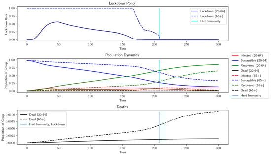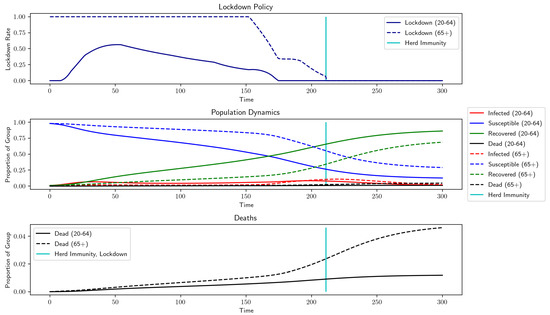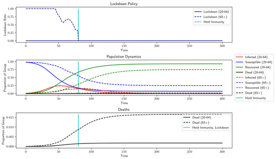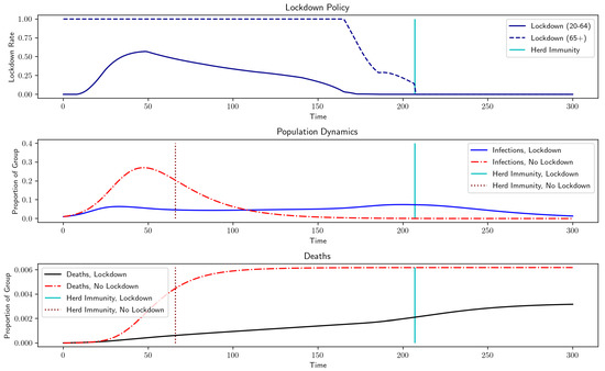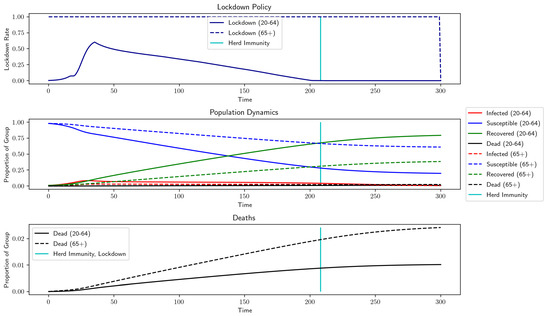To test the validity of our numerical models, we used the parameter values of [1,2] and compared our model’s recommendations to their results. A full list of the parameter values used in this section is presented in Table A1. In Figure 1, we compare a one-group version of our model with the one presented in [1], whose recommended optimal lockdown reached 70% lockdown after about one month and then slowly reduced in intensity until lockdown was lifted approximately 140 d (4.5 mo) after the outbreak began. Our version of this model maintains the maximum lockdown of 70% for slightly longer and ends slightly later. Interestingly, the ending of lockdown nearly coincides with the population reaching herd immunity, though we did not add any such considerations when running this example. In Figure 2, we set up our model to mimic the semitargeted policy from [2] and to find similar levels of output loss, total deaths, and general lockdown recommendations. Namely, the optimal strategy keeps the high-risk group in lockdown until the arrival of a vaccine, while the low-risk group is able to emerge and return to work after approximately 200 d of lockdown have elapsed. In this figure, note that the population reaches herd immunity well before the arrival of a vaccine, implying that the lockdown on the high-risk group could have been ended earlier.