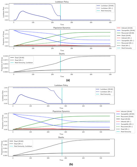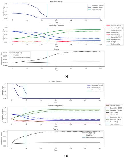 Results for varied initial conditions using benchmark parameters. (a) , lockdown: 118 d, output loss: 3.4677%, additional deaths: 0.2452%; (b) , lockdown: 52 d, output loss: 2.1755%, additional deaths: 0.3346%.